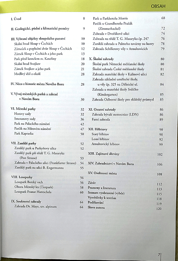 Pro mne důležitých hned několik okolností – slůvko okolí. Tedy nejen samotné město, ale (viz obsah) mnoho o Sloupu v Čechách a Svojkově. Co se týče samotného Nového Boru, pak parky existující i zaniklé, lesoparky, zahrady soukromé, školní i „firemní“. Samozřejmě i místní hřbitovy (ten Lesní je prostě unikát). Nechybí ani zahradnictví a soupis osobností, s touto „dendro“ oblastí jakkoli související.