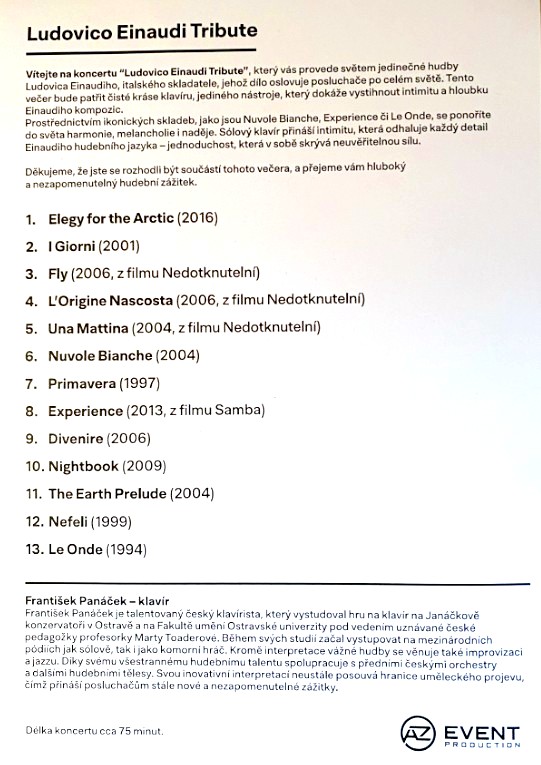 Ve středu 4. března 2026 byl ve varnsdorfském Městském divadle ke slyšení koncert věnovaný tvorbě italského pianisty a skladatele Ludovica Einaudiho.