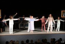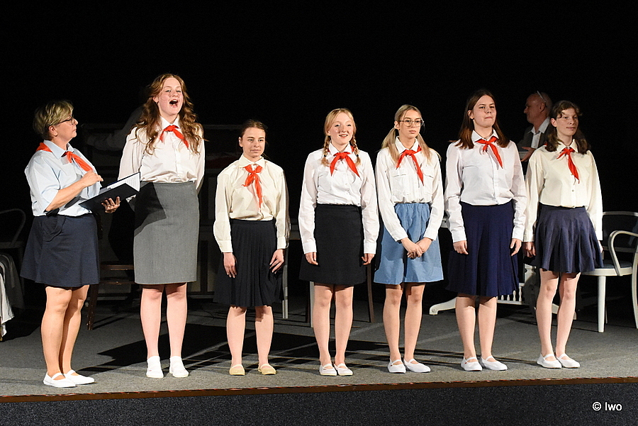 A ty „reklamní vsuvky“ nejsou samoúčelné, byť především kryjí přestavbu kulis. Jsou perfektním doplněním atmosféry, přesné, věrné – vlastně takřka historický dokument (bože, taky jsem recitoval Zpěv míru).
