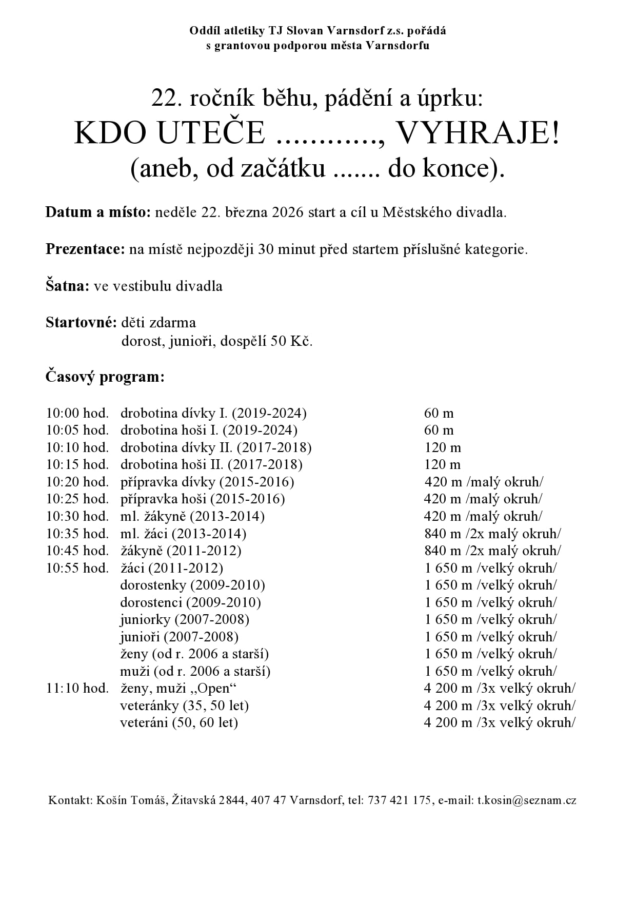 Již tuto neděli 22. března 2026 se koná 22. ročník běhu, pádění a úprku kolem Městského divadla Varnsdorf s názvem „Kdo uteče, vyhraje!“.
