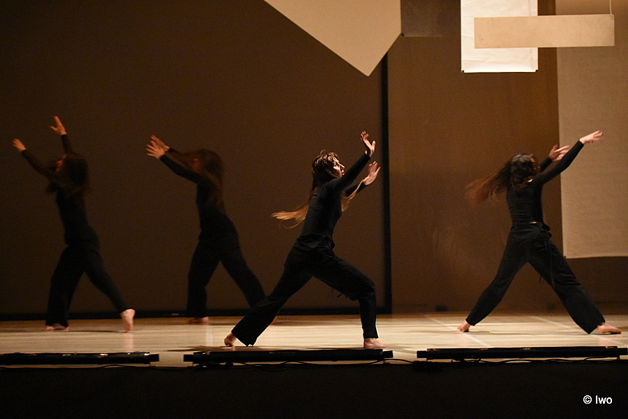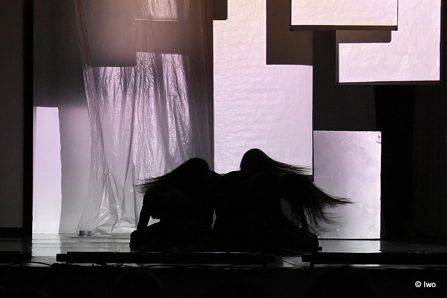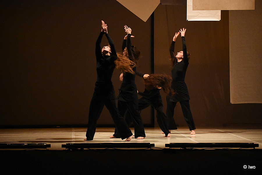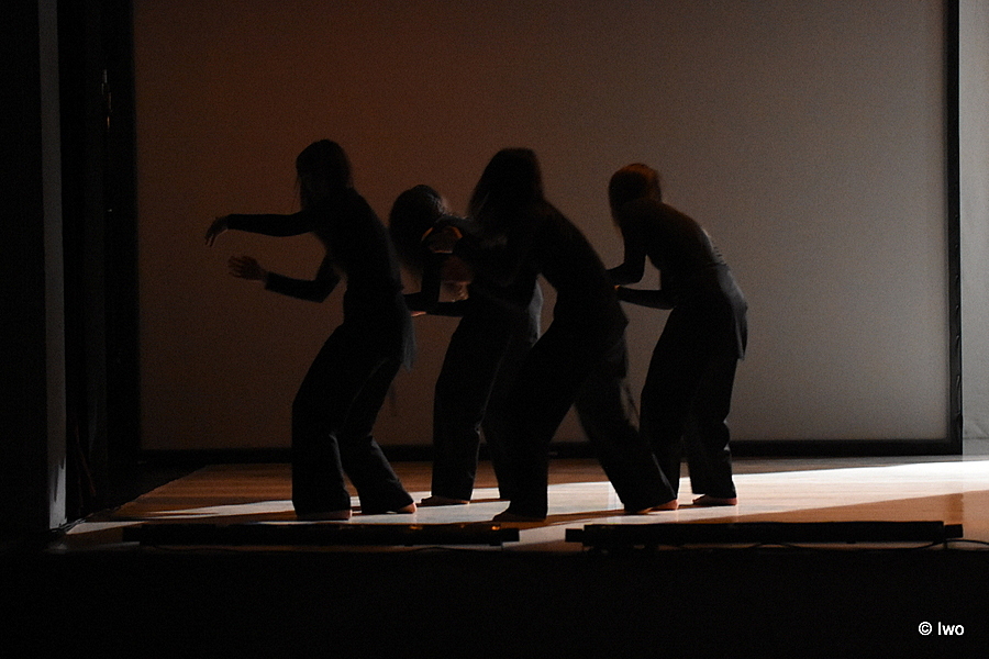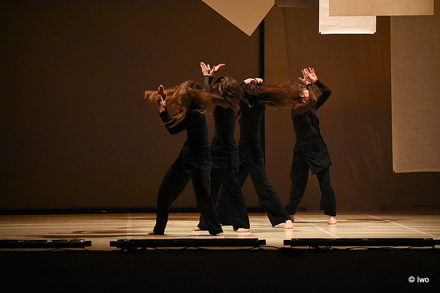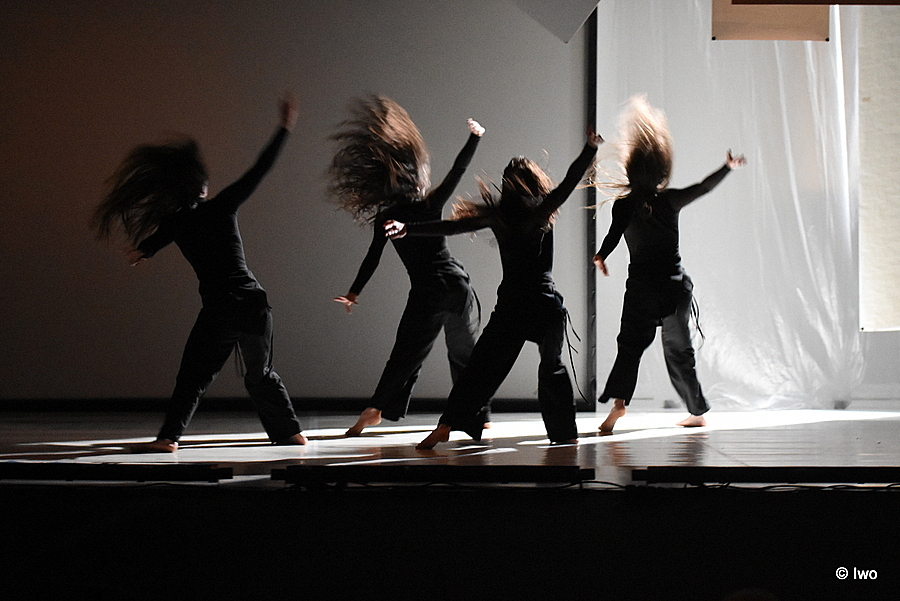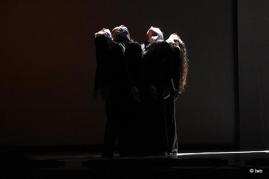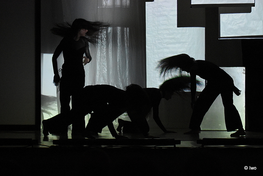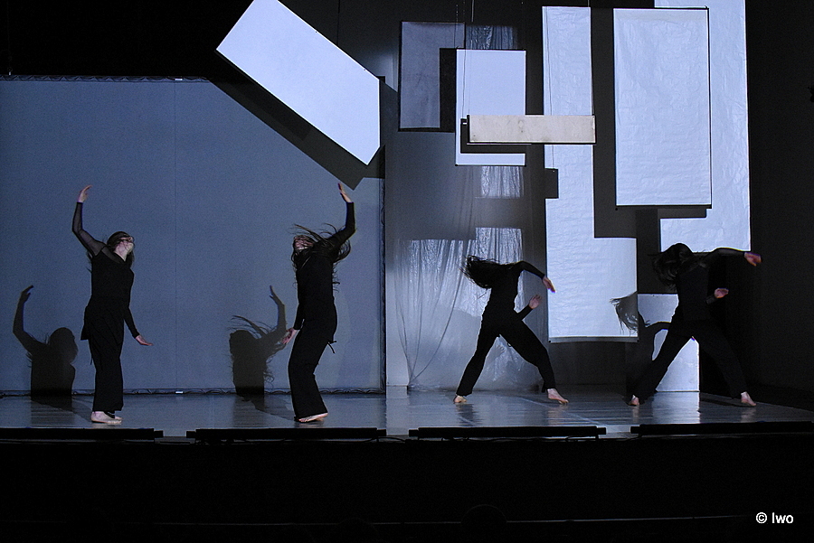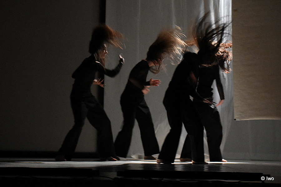 Na jevišti plátna, různorodé plochy, pár světel, sem tam projekce a čtyři tanečnice. Nejprve ticho, pak tepající zvuk – až skoro hluk. A totálně rozhozené rovnovážné ústrojí…