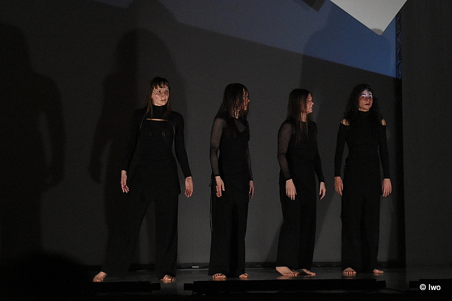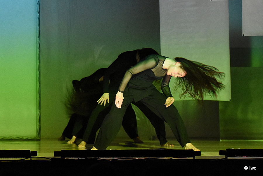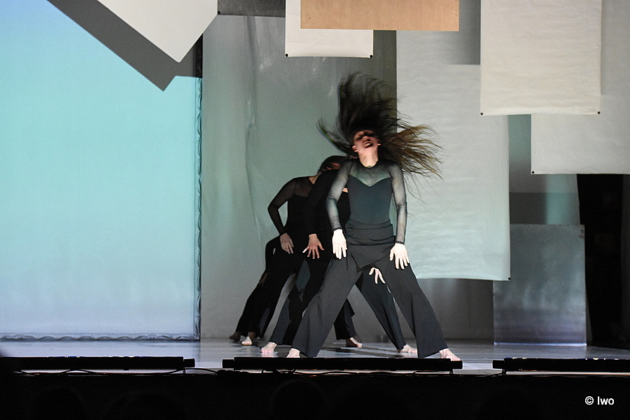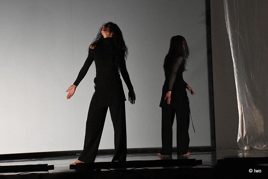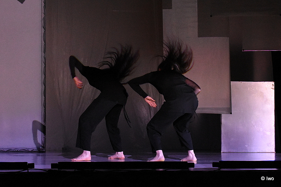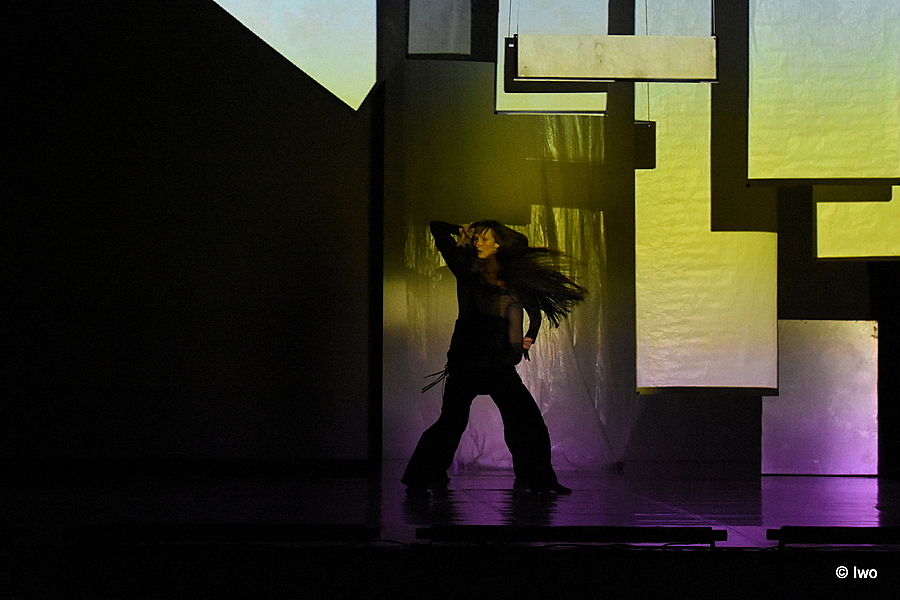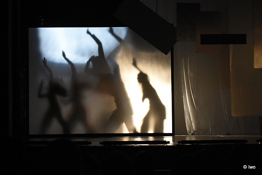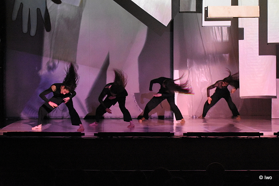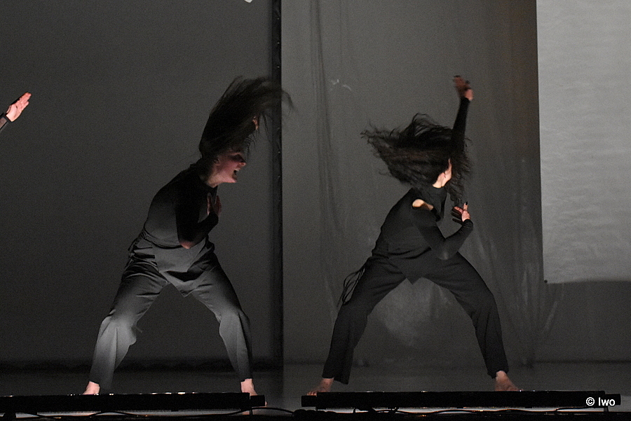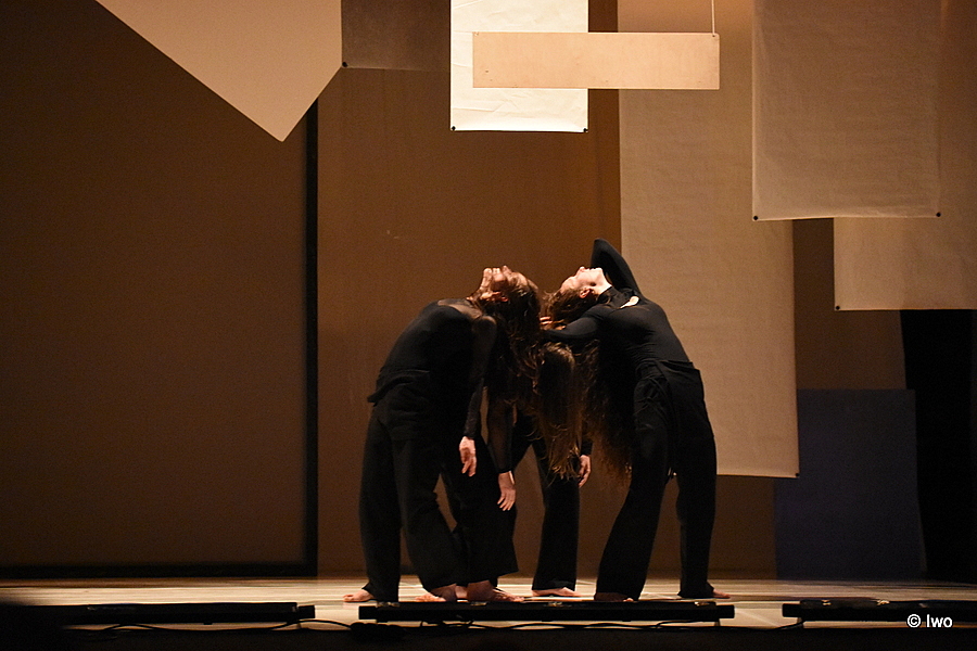 Na jevišti plátna, různorodé plochy, pár světel, sem tam projekce a čtyři tanečnice. Nejprve ticho, pak tepající zvuk – až skoro hluk. A totálně rozhozené rovnovážné ústrojí…