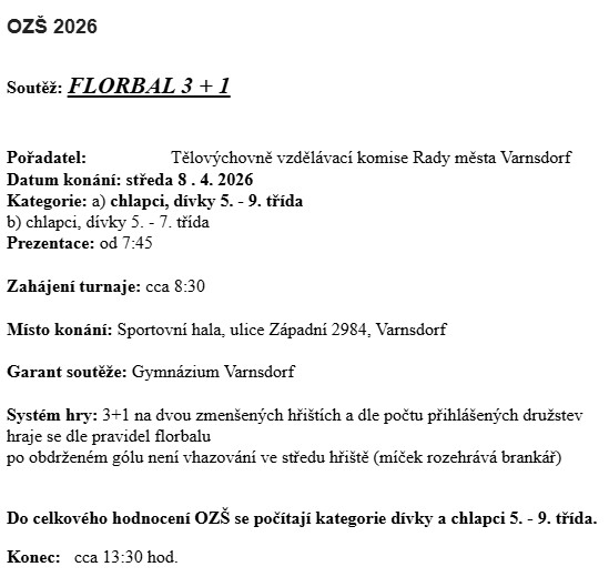 Ve středu 8. dubna 2026 pokračovaly sportovní hry pro 2. stupeň ZŠ a odpovídající ročníky víceletých gymnázií ve varnsdorfské sportovní hale další disciplínou – florbalem.