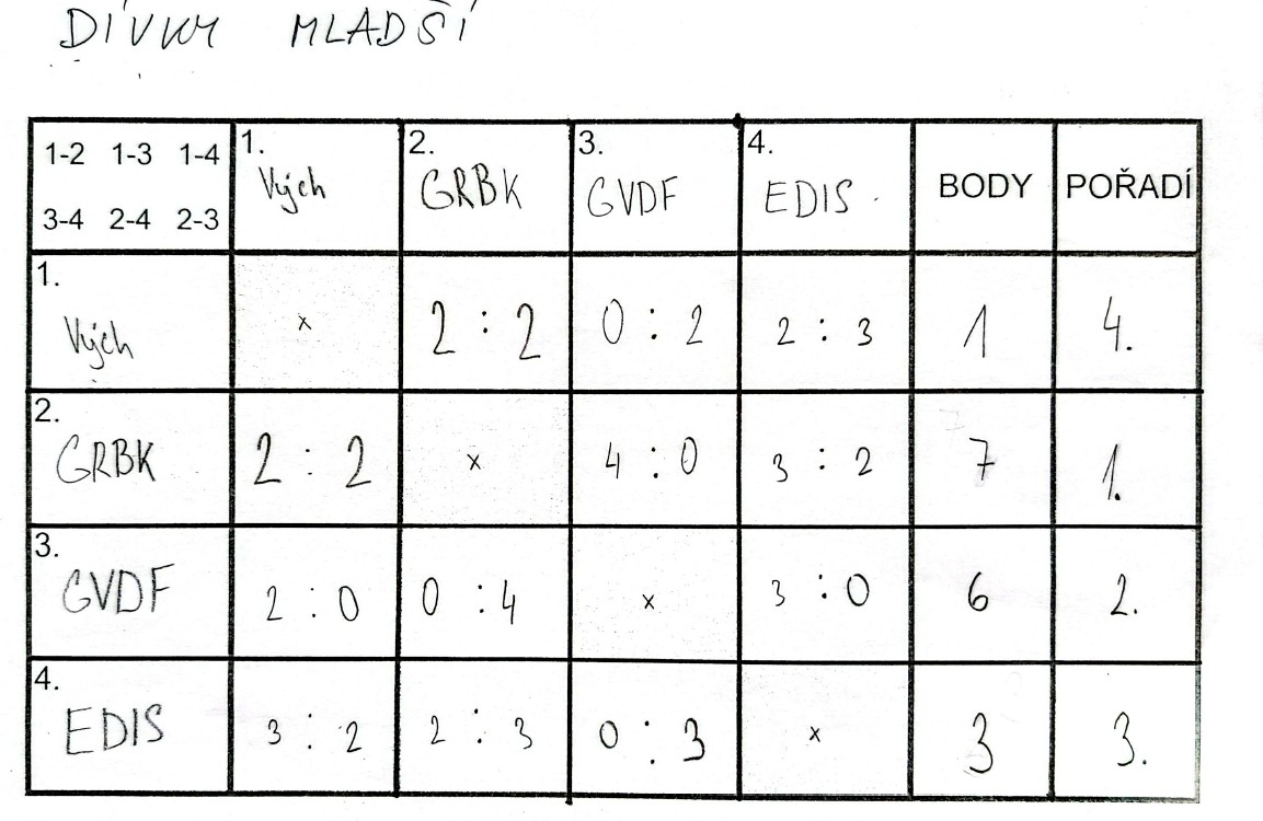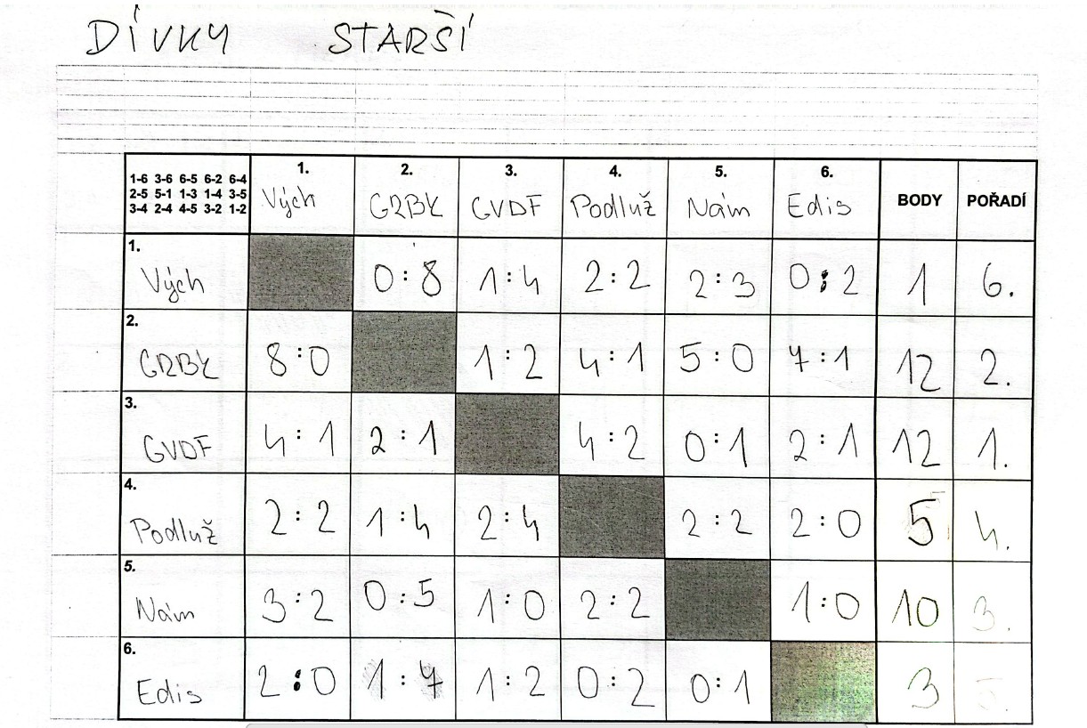 Dívčí tým vstoupil do turnaje nešťastně porážkou 0:5 proti družstvu z Gymnázia Rumburk. Následně se však děvčata rychle rozehrála a v dalších utkáních už nenašla přemožitele. Skvělý výkon korunovala v závěrečném zápase, kdy dokázala porazit i pozdější vítězky turnaje z Gymnázia Varnsdorf. Celkově si tak vybojovala velmi pěkné 3. místo.