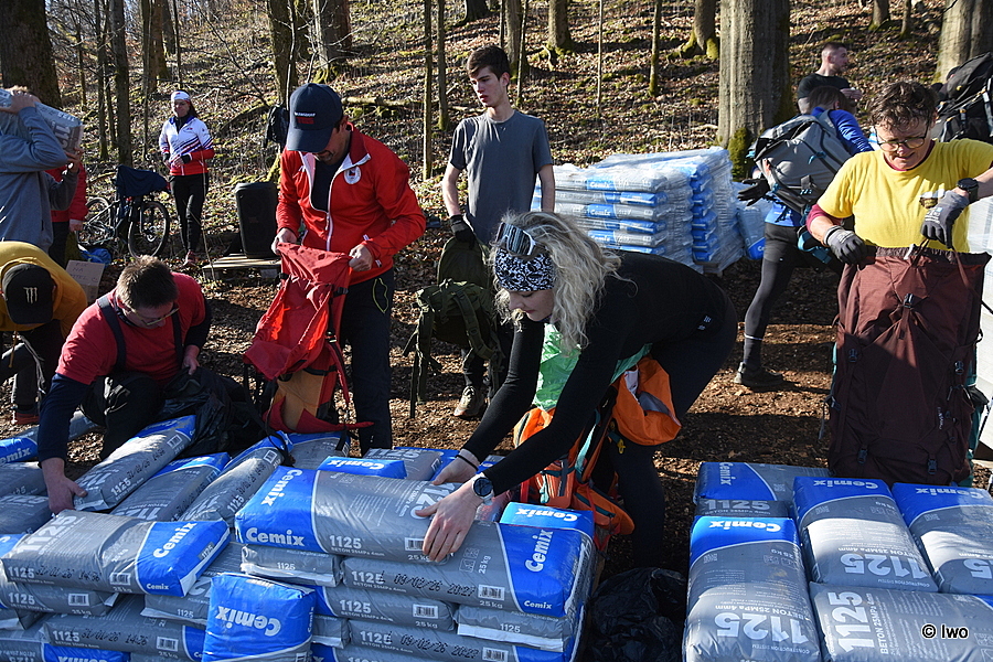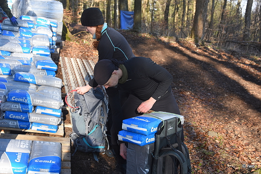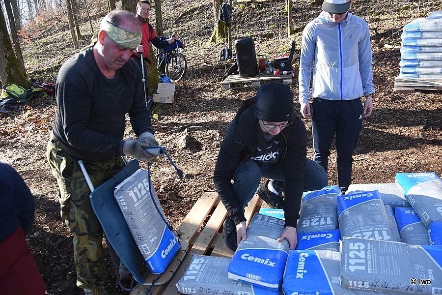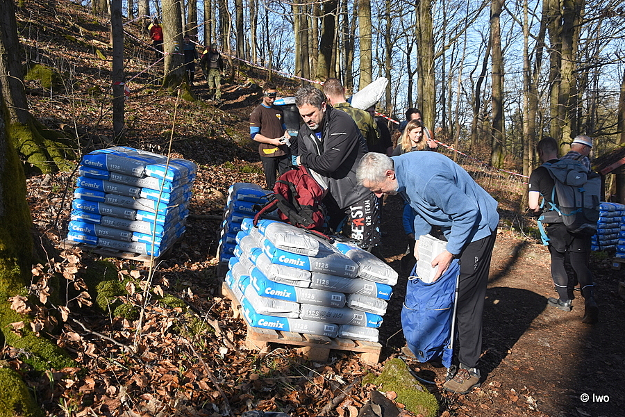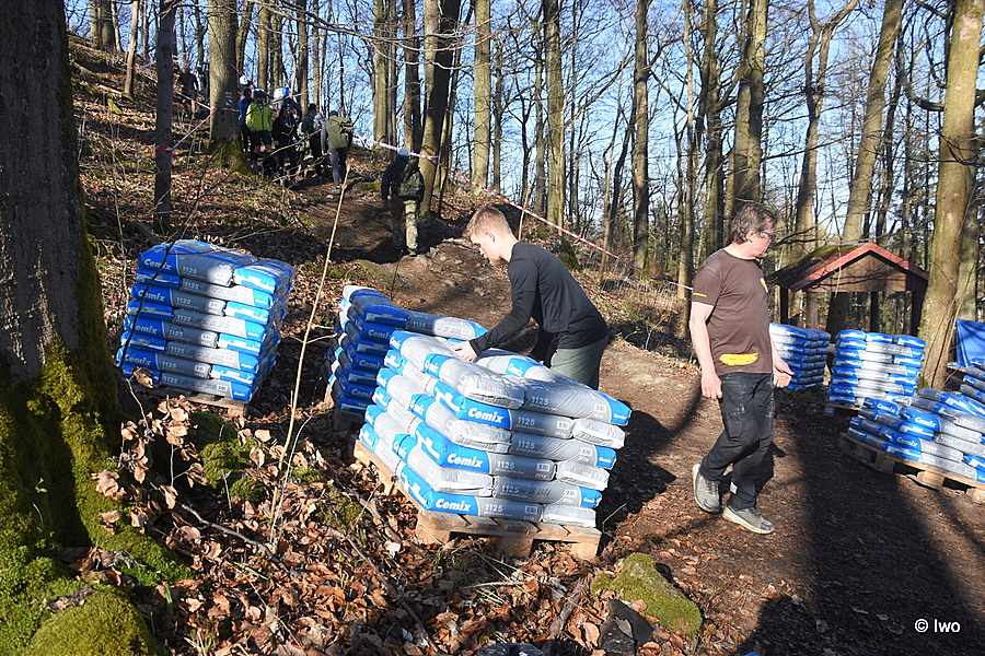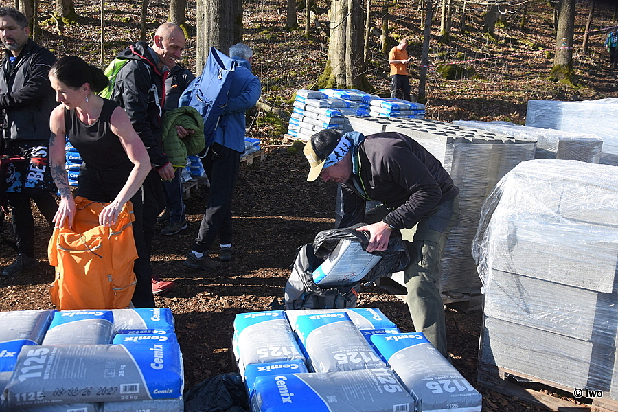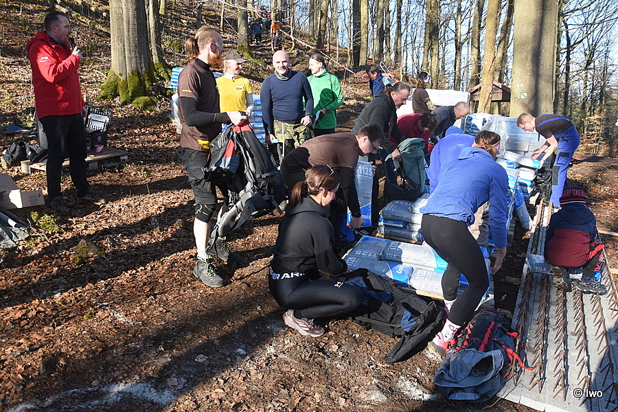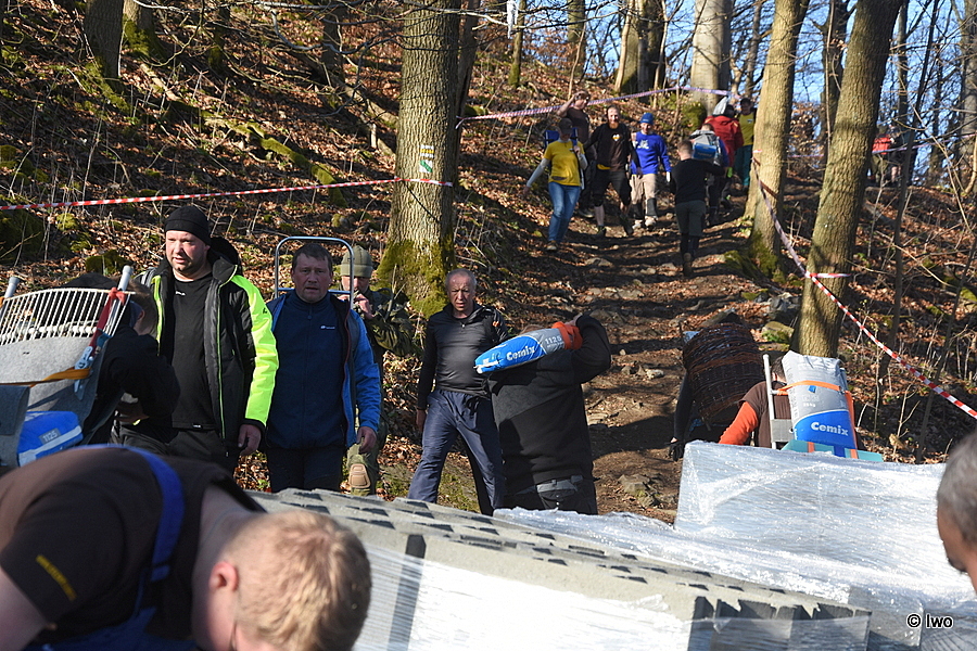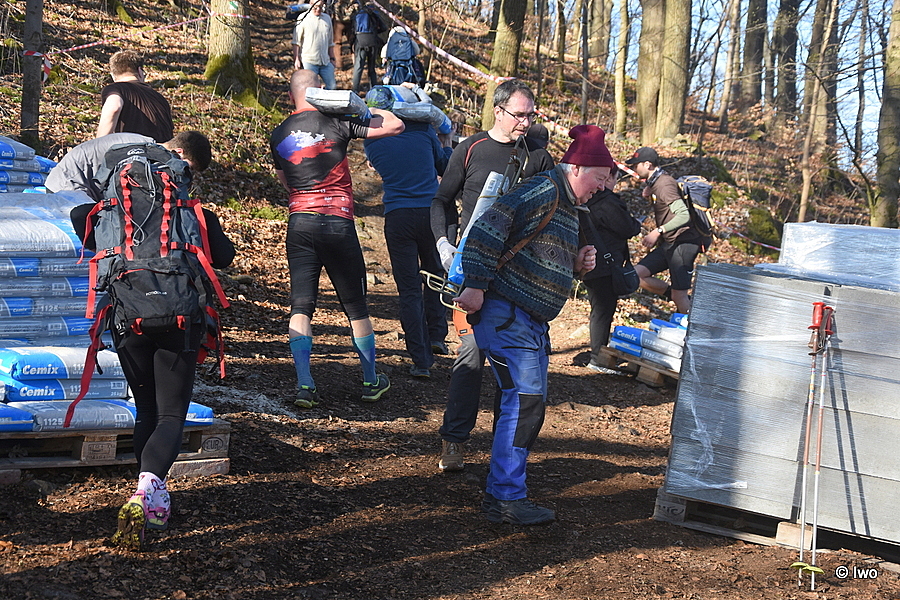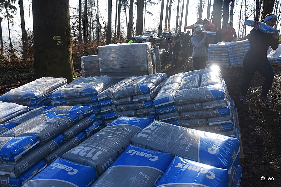 Plán byl začít oficiálním aktem v 9 hodin, účastníci měli za každý pytel dostat lístek, aby bylo možno jejich výkony evidovat, v pozvánce byla řeč o cca 800 kusech 25 kg vážících pytlů s cementovou směsí. Už před osmou hodinou ranní byla na místě skrumáž nosičů, kteří se vrhli na připravené palety (prý tu těch pytlů nakonec bylo víc než tisícovka, a navíc, jak již řečeno, i další stavební materiál). O nějaké evidenční lístky se u rozhledny nikdo nezajímal, kdo vyšel, prostě pytel složil a šel znovu, dokud síly stačily. A mám pocit, že do akce se zapojilo i dost neregistrovaných zájemců… Takže na ofiko start nedošlo, nebylo proč. Když jsem v 9:30 odcházel, přicházeli ještě stále noví nosiči a bylo prázdných asi 8 palet.