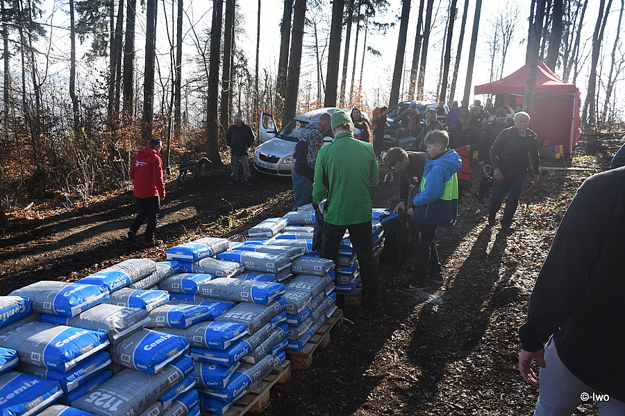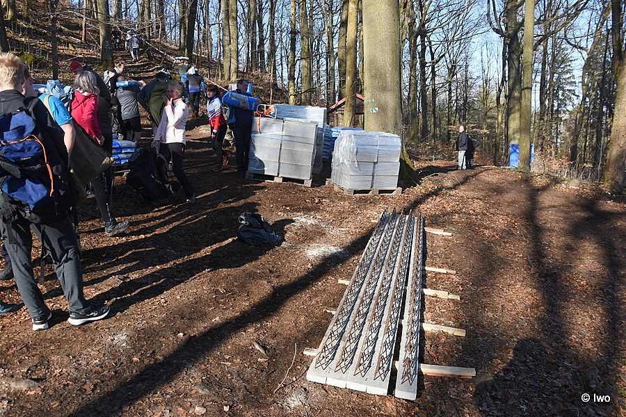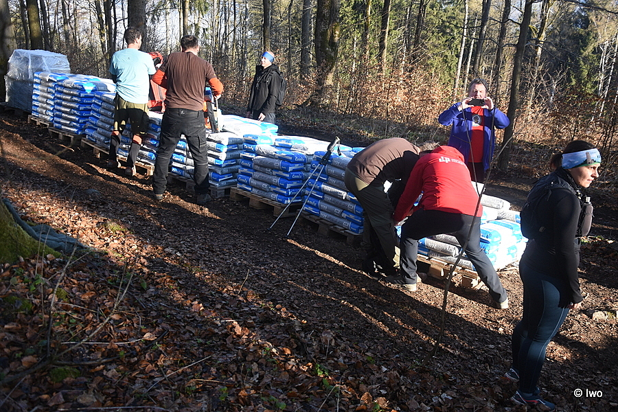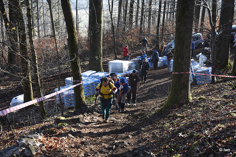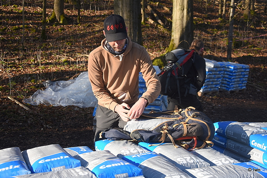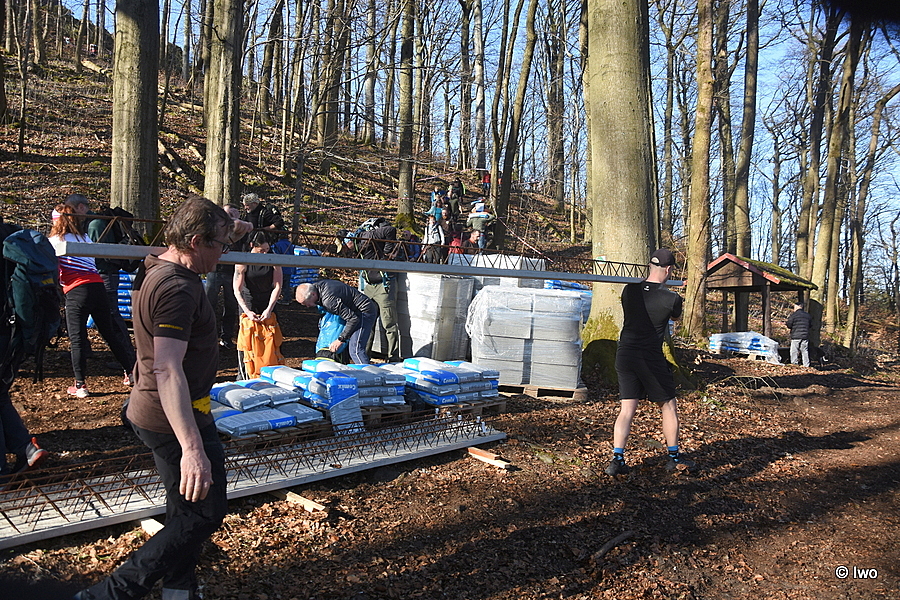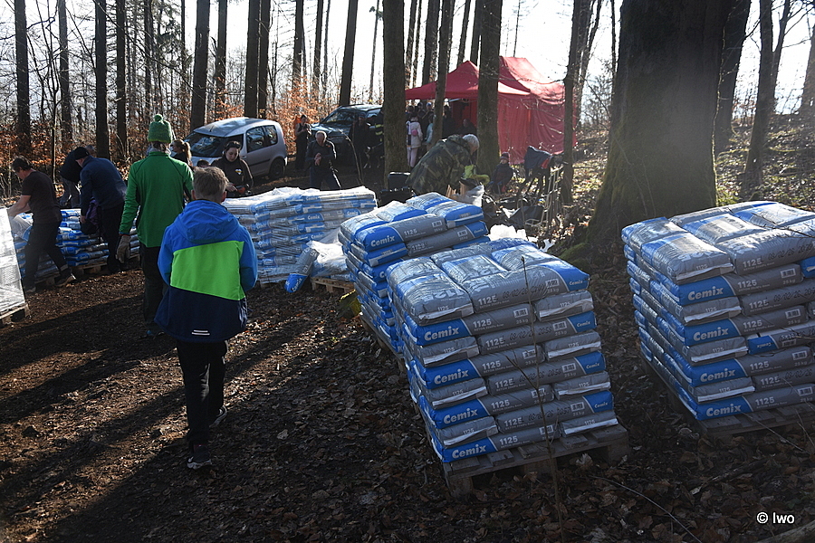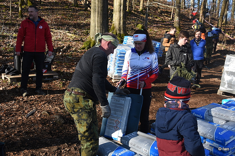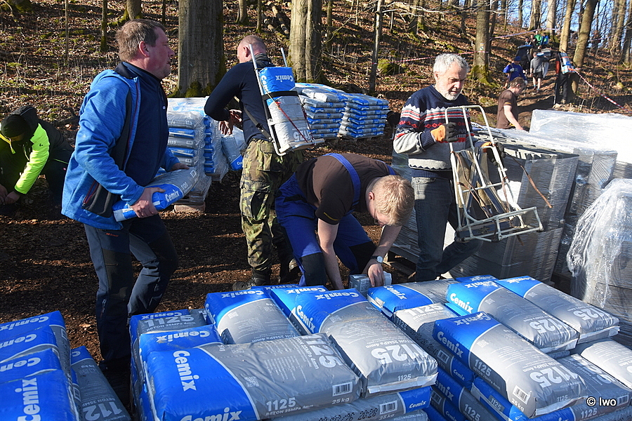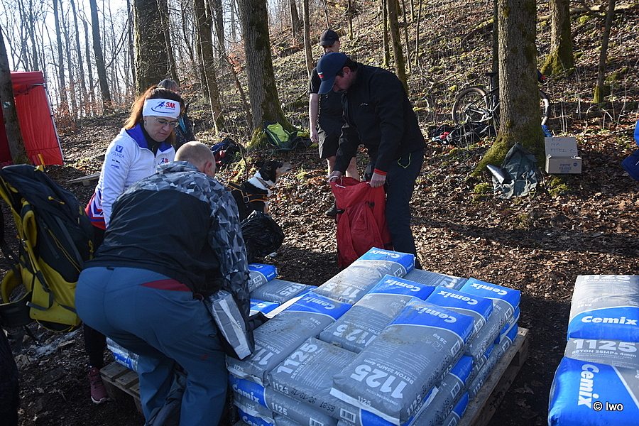 Plán byl začít oficiálním aktem v 9 hodin, účastníci měli za každý pytel dostat lístek, aby bylo možno jejich výkony evidovat, v pozvánce byla řeč o cca 800 kusech 25 kg vážících pytlů s cementovou směsí. Už před osmou hodinou ranní byla na místě skrumáž nosičů, kteří se vrhli na připravené palety (prý tu těch pytlů nakonec bylo víc než tisícovka, a navíc, jak již řečeno, i další stavební materiál). O nějaké evidenční lístky se u rozhledny nikdo nezajímal, kdo vyšel, prostě pytel složil a šel znovu, dokud síly stačily. A mám pocit, že do akce se zapojilo i dost neregistrovaných zájemců… Takže na ofiko start nedošlo, nebylo proč. Když jsem v 9:30 odcházel, přicházeli ještě stále noví nosiči a bylo prázdných asi 8 palet.