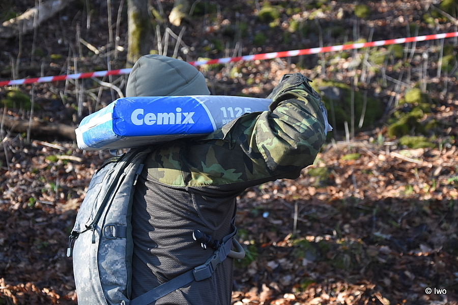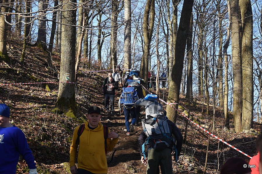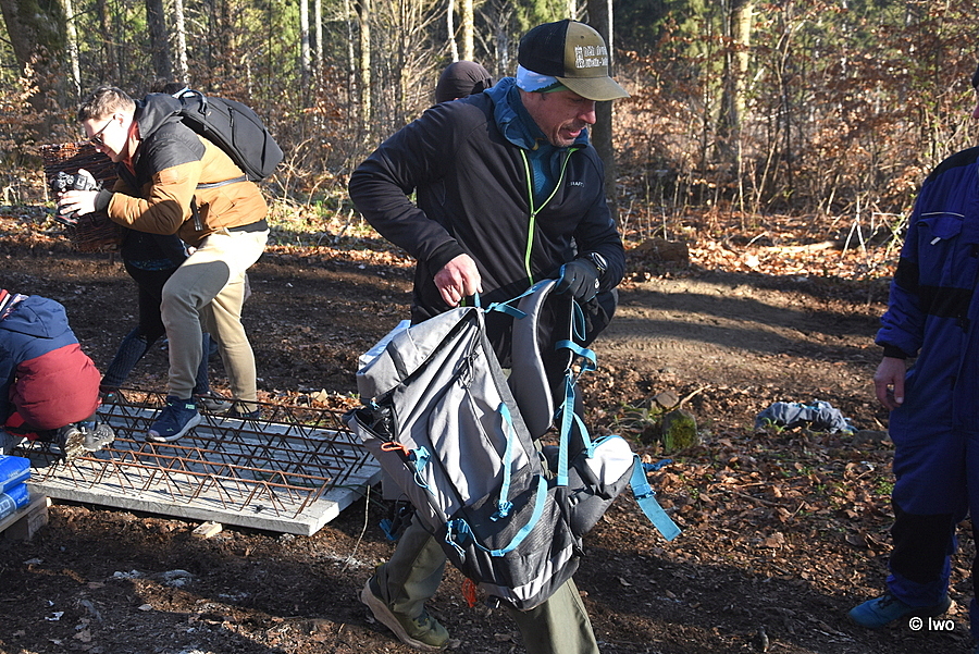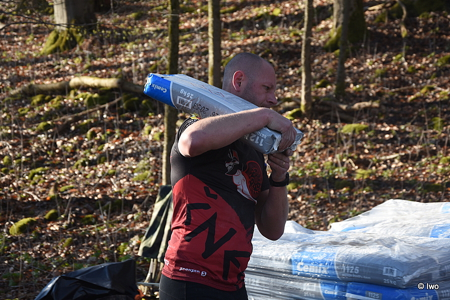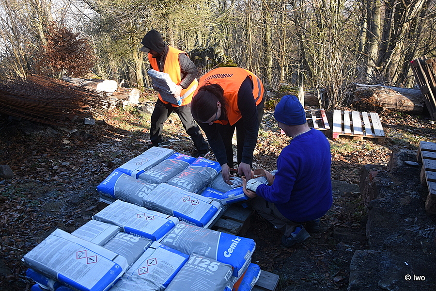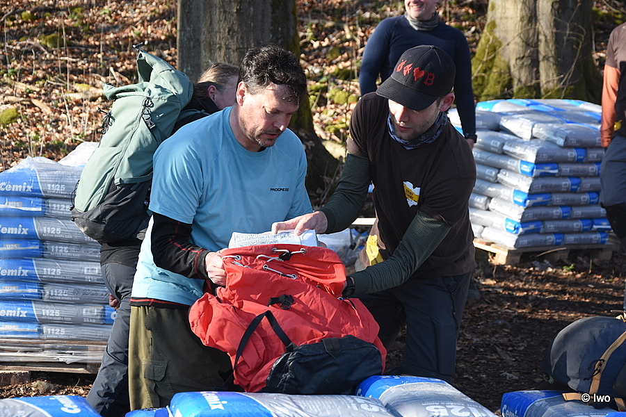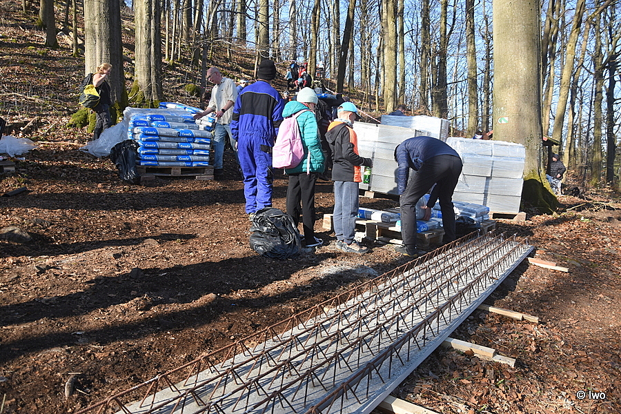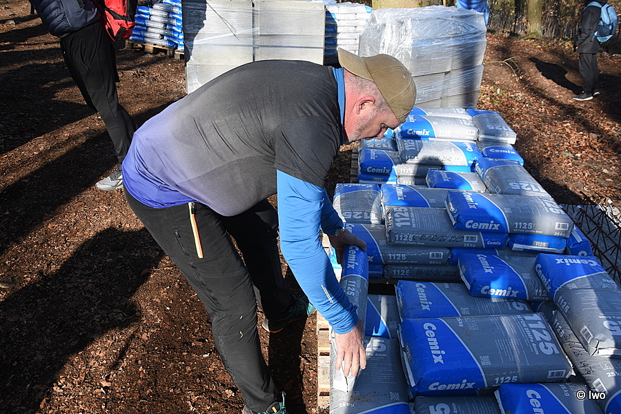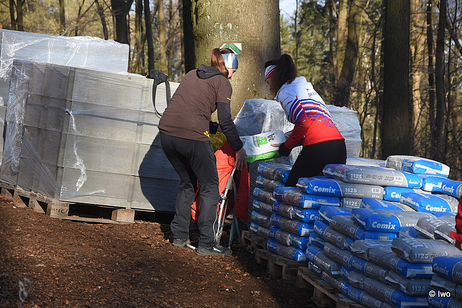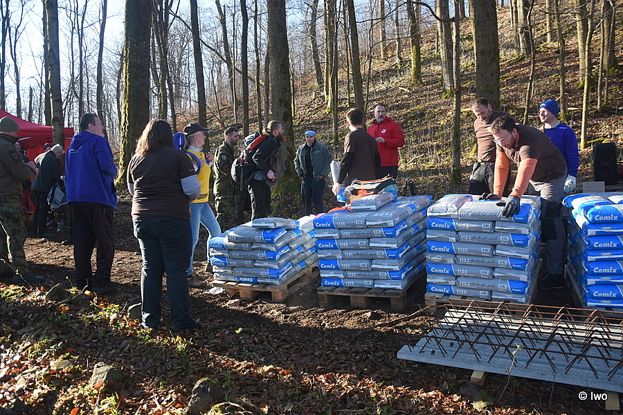 Plán byl začít oficiálním aktem v 9 hodin, účastníci měli za každý pytel dostat lístek, aby bylo možno jejich výkony evidovat, v pozvánce byla řeč o cca 800 kusech 25 kg vážících pytlů s cementovou směsí. Už před osmou hodinou ranní byla na místě skrumáž nosičů, kteří se vrhli na připravené palety (prý tu těch pytlů nakonec bylo víc než tisícovka, a navíc, jak již řečeno, i další stavební materiál). O nějaké evidenční lístky se u rozhledny nikdo nezajímal, kdo vyšel, prostě pytel složil a šel znovu, dokud síly stačily. A mám pocit, že do akce se zapojilo i dost neregistrovaných zájemců… Takže na ofiko start nedošlo, nebylo proč. Když jsem v 9:30 odcházel, přicházeli ještě stále noví nosiči a bylo prázdných asi 8 palet.