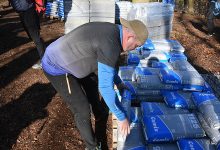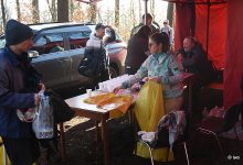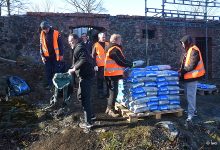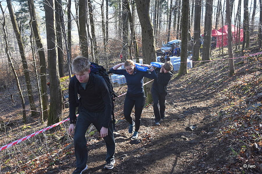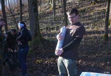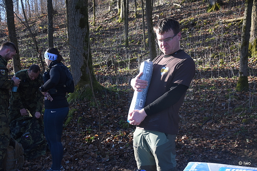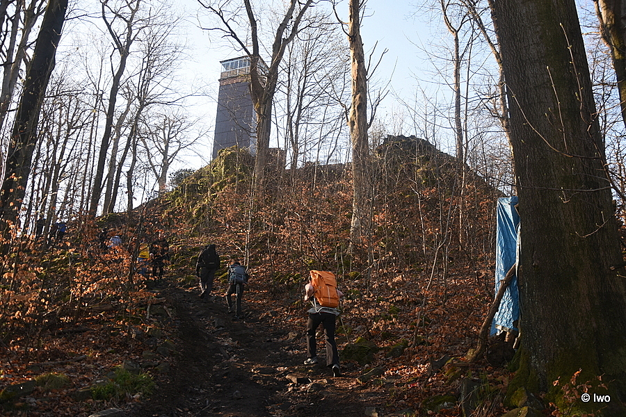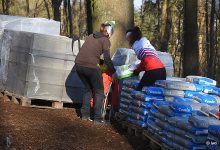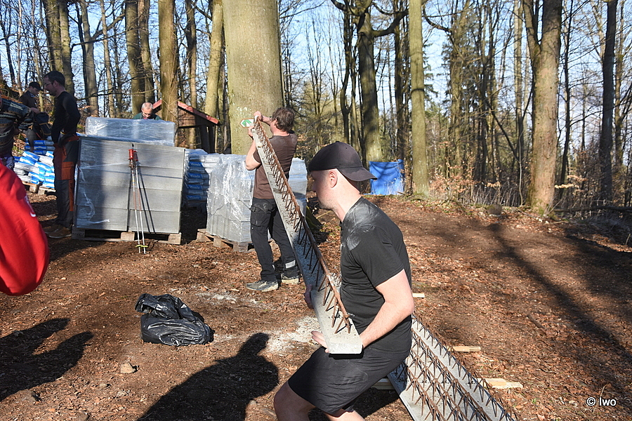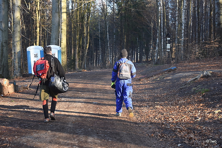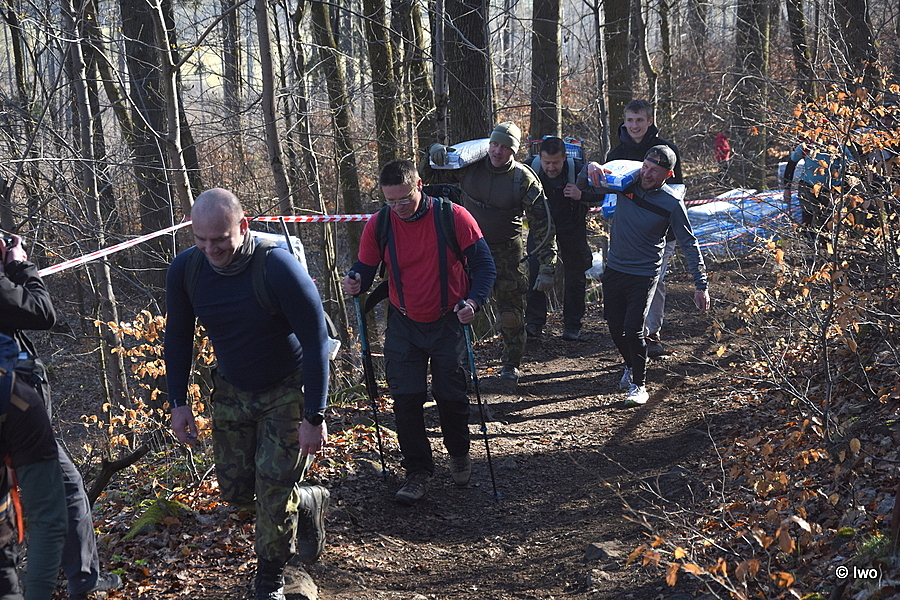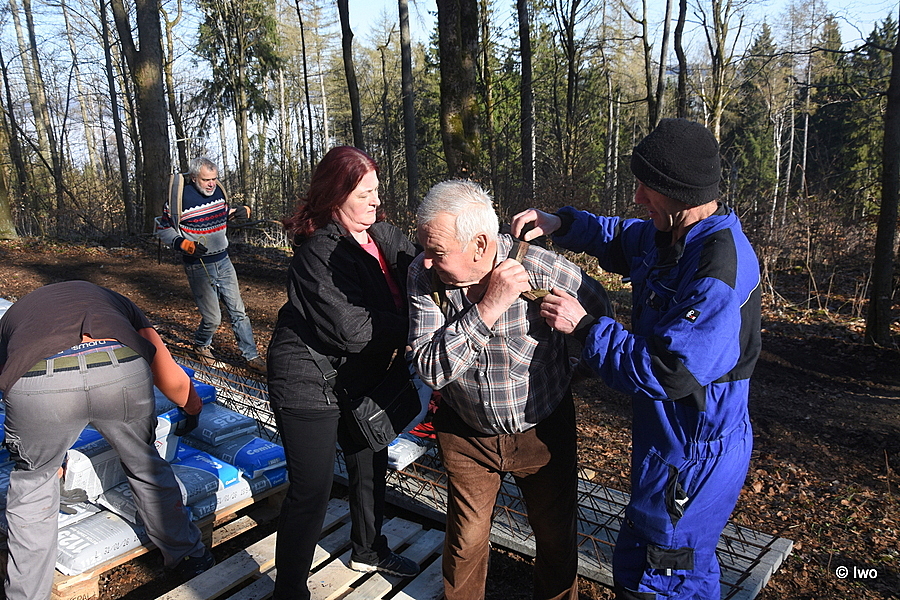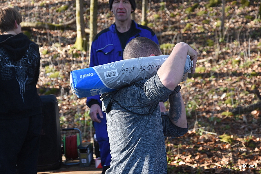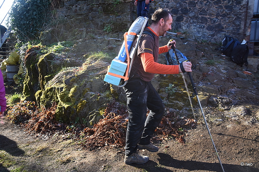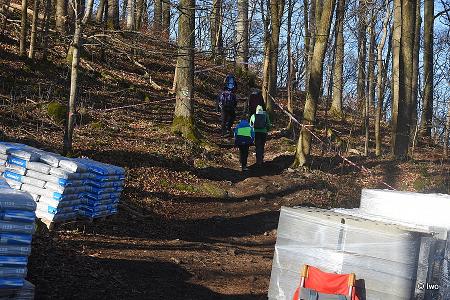 Plán byl začít oficiálním aktem v 9 hodin, účastníci měli za každý pytel dostat lístek, aby bylo možno jejich výkony evidovat, v pozvánce byla řeč o cca 800 kusech 25 kg vážících pytlů s cementovou směsí. Už před osmou hodinou ranní byla na místě skrumáž nosičů, kteří se vrhli na připravené palety (prý tu těch pytlů nakonec bylo víc než tisícovka, a navíc, jak již řečeno, i další stavební materiál). O nějaké evidenční lístky se u rozhledny nikdo nezajímal, kdo vyšel, prostě pytel složil a šel znovu, dokud síly stačily. A mám pocit, že do akce se zapojilo i dost neregistrovaných zájemců… Takže na ofiko start nedošlo, nebylo proč. Když jsem v 9:30 odcházel, přicházeli ještě stále noví nosiči a bylo prázdných asi 8 palet.