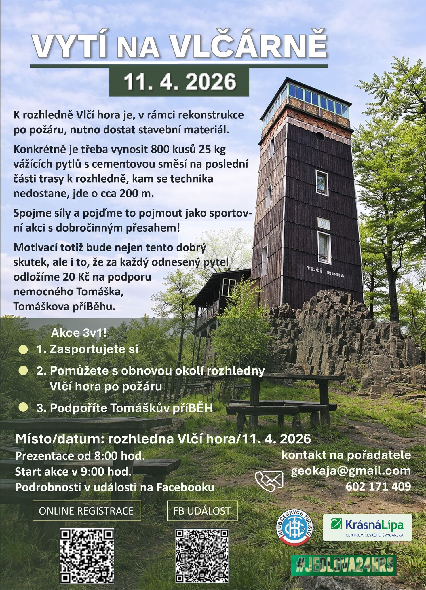 V sobotu 11. dubna 2026 proběhla u rozhledny na Vlčí Hoře sportovně-turisticko-charitativní akce Vytí na Vlčárně.