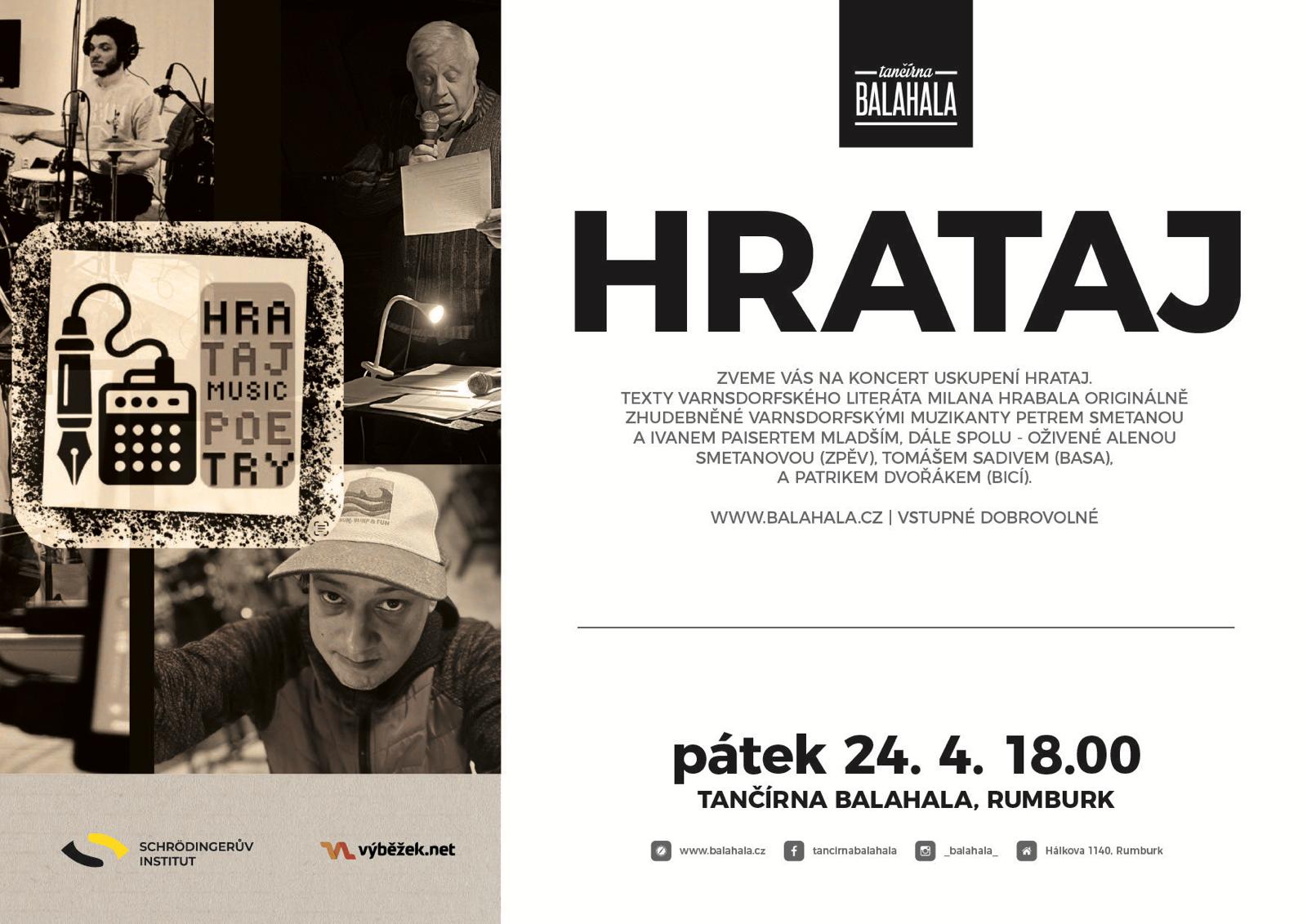 Zveme vás na koncert uskupení Hrataj. Texty varnsdorfského literáta Milana Hrabala originálně zhudebněné varnsdorfskými muzikanty Petrem Smetanou a Ivanem Paisertem mladším – oživené Alenou Smetanovou (zpěv), Tomášem Sadivem (basa), a Patrikem Dvořákem (bicí).