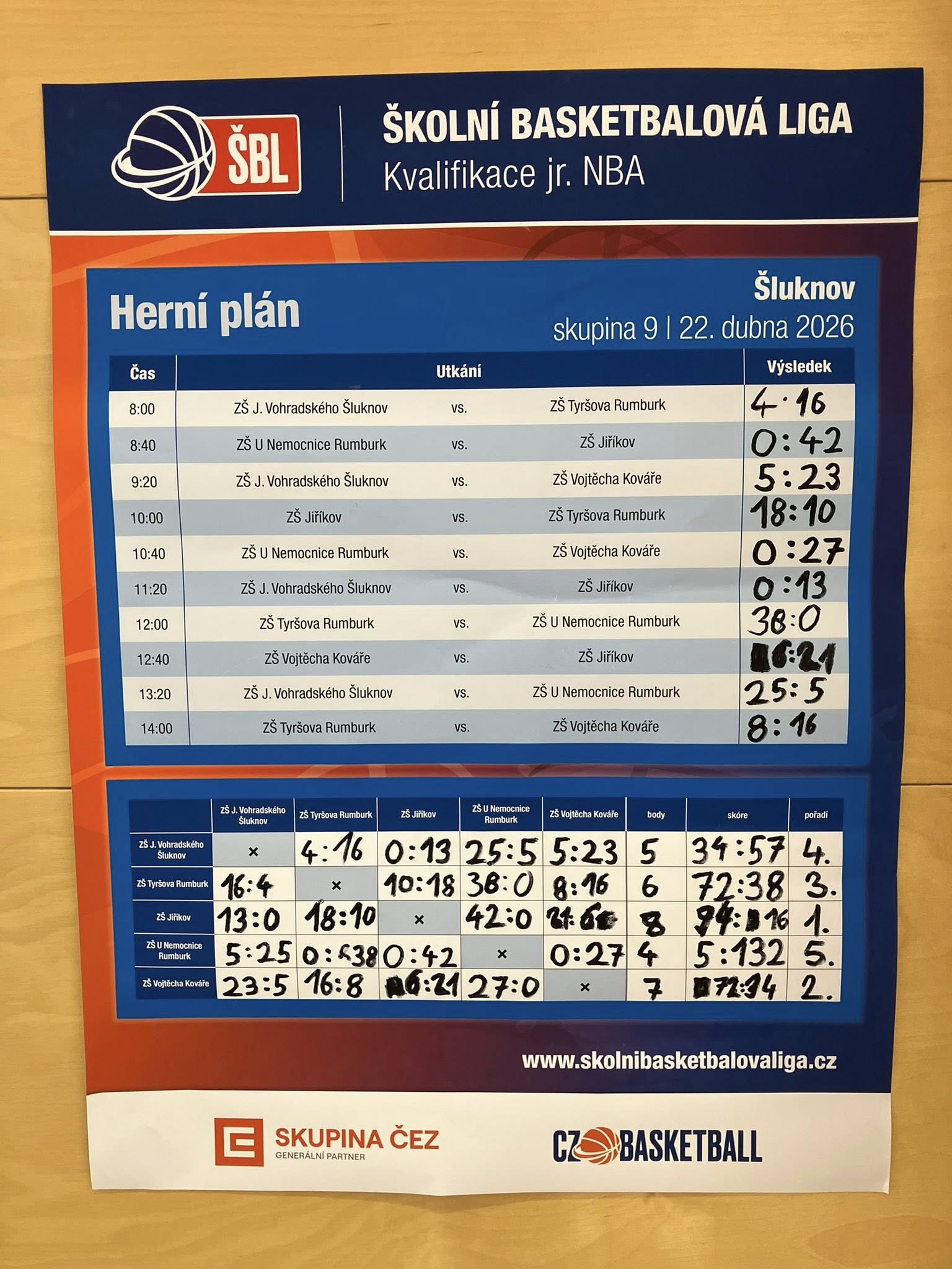 22. 4. 2026 – Dnes jsme zažili opravdu skvělý den plný sportu, radosti a týmového ducha! Naše škola se zúčastnila školní basketbalové ligy a rozhodně jsme se mezi ostatními týmy neztratili. Hned v prvním zápase jsme nastoupili proti Základní škole Šluknov, kde jsme předvedli výborný výkon a zaslouženě zvítězili 23:5. Skvělá obrana i útok nám zajistily pohodlný začátek turnaje. Druhým soupeřem byla Základní škola U Nemocnice. Tento zápas byl pro nás ještě úspěšnější, vyhráli jsme přesvědčivě 27:0! Na hřišti jsme si perfektně rozuměli a ukázali jsme sílu našeho týmu. Třetí utkání proti ZŠ Tyršova bylo o něco napínavější, ale i tak jsme ho zvládli a zvítězili 16:8. Bojovali jsme do poslední minuty. Poslední zápas jsme odehráli proti ZŠ Jiříkov. Tentokrát byl soupeř silnější a i přes naši snahu jsme bohužel prohráli 6:21. I tak jsme ale bojovali a nevzdali jsme se, což si zaslouží velký respekt. Celý den jsme si neskutečně užili. Podporovali jsme se navzájem, fandili si a hráli jako jeden tým. Panovala skvělá atmosféra plná radosti, smíchu a sportovního nadšení.