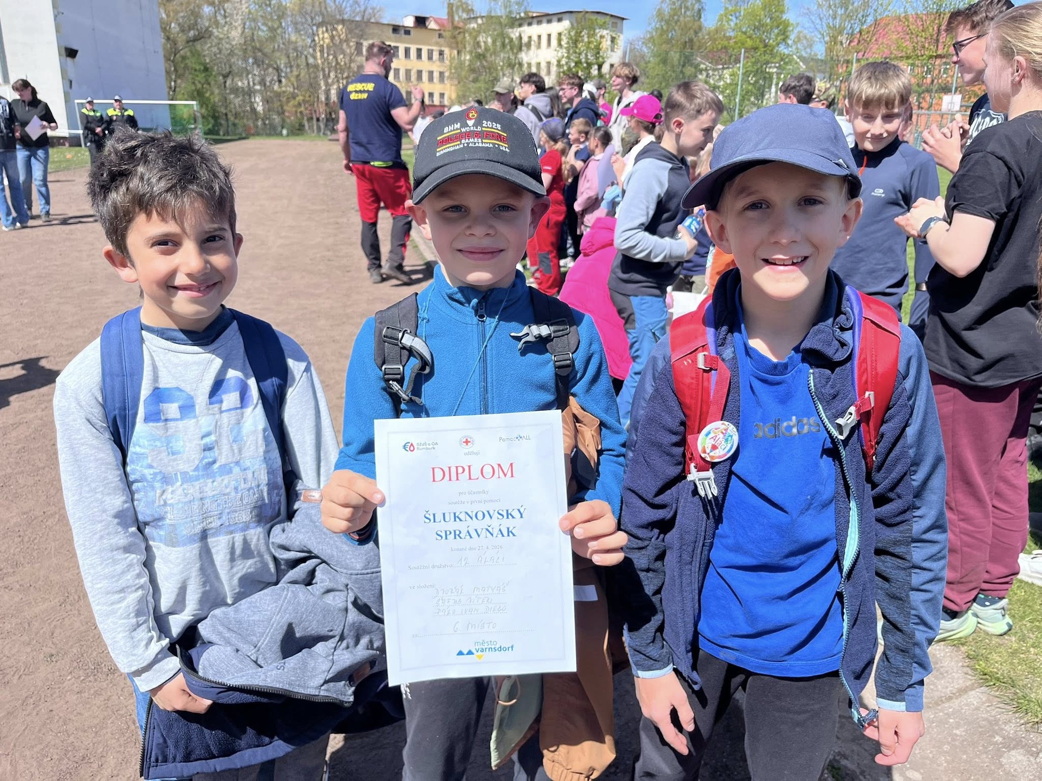 Maty, Ivan a Vítek – to bylo složení týmu Áláci z kroužku ZDRAVOTNÍČEK. Na dnešní soutěži SPRÁVŇÁK 2026, 8. ročník, obsadili krásné 6. místo z celkových 13 v kategorii 1. st. ZŠ. Tříčlenné týmy soutěžily v poskytování první pomoci v šesti modelových situacích pod dozorem zkušených záchranářů. Klukům se vedlo velice dobře, do řešení modelových situací se pustili s odvahou, využili vše, co se na kroužku naučili. Na co si nevzpomněli, si nechali vysvětlit a odešli s cennými zkušenostmi. A přestože to byla jejich první velká soutěž, byli výborní a my, Pája a Ála, jsme na ně moc pyšní, že v takové obrovské konkurenci skvěle reprezentovali DDM Varnsdorf.