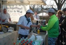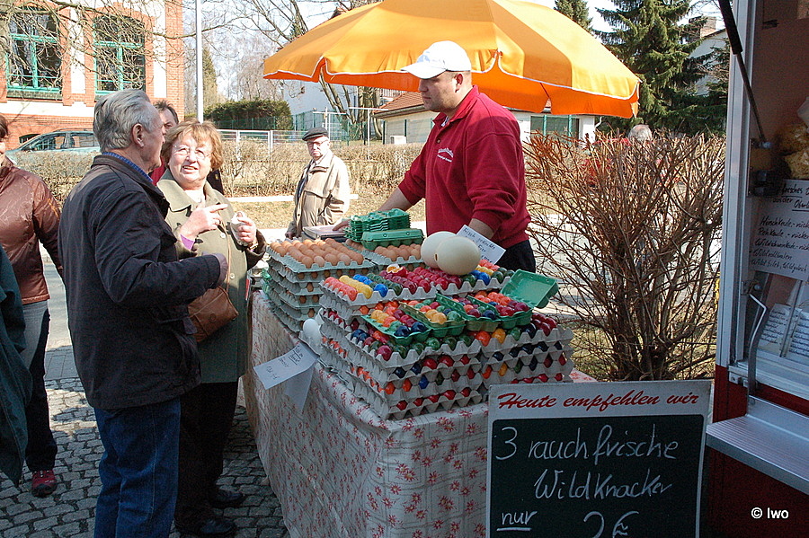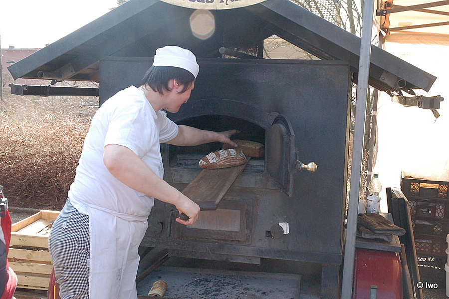 Po sobotním dlouhém dnu stále ještě neslyšíce a smrdíce (přece jen stát takřka polovinu dne vedle reprobeden u mládeže, zdolávající pivo za pivem a nedaleko party, posilující své zážitky trávou, je docela náročné) jsem vyrazil v neděli dopoledne 18. března 2012 do Němec. I když byla akce prezentována jako 16. hornolužický den pláteníků, jednalo se o tradiční Karáskovy trhy. A pokud jsem si tuhle stěžoval, že v Praze se krámy z mých oblíbených míst při každé návštěvě vytrácejí do neznáma, pak tady je rok co rok, pololetí co pololetí vše na svém místě. Uzené makrely, kytičky, keramika, kožešiny, sýry, paní Horáčková s knihami, jizerskohorské trvalky s dřevěnými hračkami a medem, výrobky ze dřeva, dečky, ubrusy, papuče a wursty. A na to vše dohlíží sám loupežnický hejtman v doprovodu své družiny bystrým okem. Odpoledne prý přihopkal i velikonoční králíček, ale to já už doma stahoval fotky a má druhá polovice si zapomněla foťák u herdule…