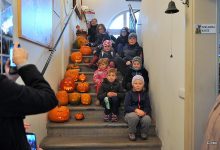 Původně jsem sice neměl v úmyslu se na hrádek vypravit, leč byl jsem nakonec dobrými lidmi zviklán, ať se zaskočím podívat. A heuréka – letošní ročník konečně prorazil do vědomí místních a na schodech se tu sešel slušný počet vyřezávačů. I když jde o událost, související s importovaným svátkem, v téhle podobě je i pro mne přijatelný. Po osvětlení výtvorů na schodech do věže a kolektivním fotografování si sice leckteré dítko vyvzdorovalo, že ta jejich dýně je tak pěkná, že si ji musí vzít domů, přesto jich dost zůstalo na místě, aby vítaly návštěvníky.