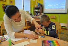Vcelku žádné změny, opět kostýmování hlídači u dveří v rolích průvodců po škole. Ve třídách dílničky, hrací koutek, zápis nanečisto, na chodbě občerstvovací stanice… Jen jsem musel dost dlouho čekat, než se vůbec nějací rodičové s ratolestmi objeví, abych neměl na fotkách jen prázdné třídy. Možná i proto, že na webu školy nic, FB škola nemá a upoutávka se objevila v Hlasu severu, který se rozvážel jeden jediný den předem.