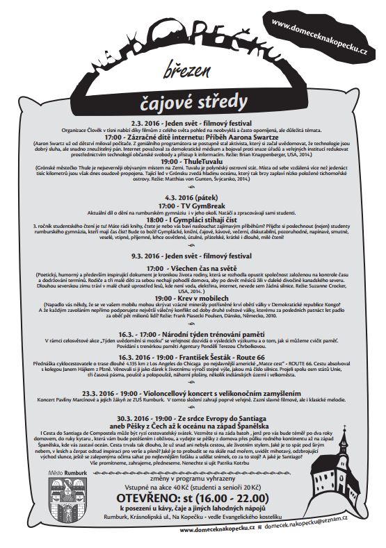 Ve středu 16. března 2016 na Kopečku něco s pamětí a pak Route66, ve varnsdorfském Městském divadle Dokonalá svatba, ve Šluknově na zámku klavírní recitál Jana Šimandla, v Rumburku na Střelnici Velká zebra a v Podluží budou Součkovi vyprávět o svém putování Asií.