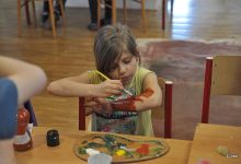 V prostoru ZUŠky se vyskytuji relativně často, takže jsem vyrazil na Den otevřených dveří s úmyslem na začátku jen tak zběžně nakouknout, projít, něco nafotit. A vrátit se zvečera na slavnostní koncert. Nakonec to ale dopadlo všechno jinak. Na příchozí čekali průvodci z řad žáků školy, kteří každému udělili perníkovou medaili a provedli ho budovou od vchodu až na půdu. Tak se stalo, že jsem viděl i dosud neviděné… Hlavně jsem se ale zasekl v půdním ateliéru výtvarné výchovy. Tady se chystal velký projekt – strom, zem, květiny, pohyb, hudba, tělo a barvy… Jen jsem stál opodál, fotil a natáčel (s pomocí své občasné malé průvodkyně) a na konci jsem měl taky na kalhotách stopy po křídě a na dlaních tempery… Na chodbách zatím vyhrávala různá uskupení, ve třídách probíhala výuka, lidi chodili a okukovali. Najednou bylo pozdě odejít a zase se vracet, takže jsem zůstal rovnou na ten koncert. Sál se tentokrát zaplnil k prasknutí, a na konci čekalo opravdové překvapení – smíšeně improvizovaný sbor. No, a ze závěrečného rautu jsem toho moc neměl, bylo potřeba se připravit na další koncert.