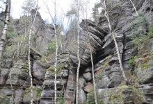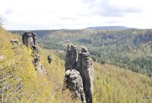 Po spoustě zastávek k focení přece jen na německé straně vystupujeme. Neznačenými cestami úžasným skalním terénem sestupujeme do údolí říčky Biela, kde se napojíme na místní značení a míříme k dnešnímu prvnímu cíli. Skalní vyhlídka Grenzplatte – otevírá se před námi prosluněné panorama, na obzoru Děčínský Sněžník, pod námi Ostrov. Kocháme se, svačíme, pózujeme. Po červené směr Ottomühle a Herkulovy sloupy. Zastavujeme u Bennohöhle – není to jeskyně v pravém slova smyslu, tyhle útvary tu vznikají zvětráváním a řícením.