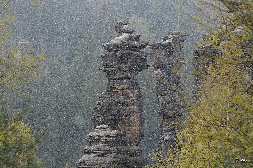 Konečně zpět v údolí. Ovšem volíme nejprve opačný směr – kousek od Ottomühle jsou další jeskyňky, Schwedenhöhle a Eisloch. V té druhé má být věčný led a sníh, ale není. Za chvíli nám to ovšem vynahradí prudká změna počasí. Když se od kiosku u parkoviště vydáme k Herkulovým sloupům, začne poměrně hustě sněžit.