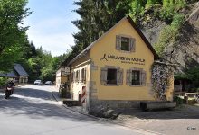 Dále kolem bývalých mlýnů, nyní penzionů Buschmühle a Neumannmühle. Silnici měníme zpět na přírodu, na Vorařskou stezku (Flössersteig) po levém břehu Křinice, do rokle Malý Zschand a konečně je před námi Kuhstall. Ten už mnozí známe, ale je to jedno, protože většina se nejprve vrhá k výčepnímu okénku a až po vyprázdnění lahví se začne starat o prohlídku zdejšího skalního útvaru. A už jen závěrečný pohodový sestup zpět do údolí Křinice ke konečné tramvaje (Lichtenhainer Wasserfall). Tady naše zážitky prohloubil zvířecí utopenec v korytě.