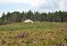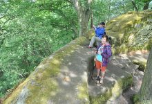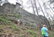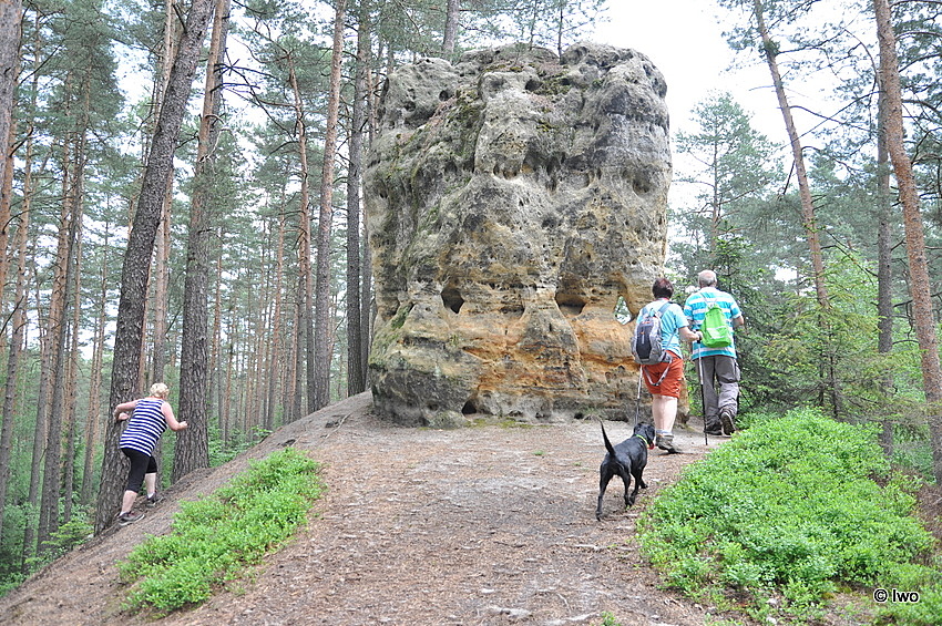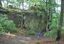 Černý rybník, přírodní památky s rašeliništěm. Černo v něm opravdu je, na mělčině sebou melou stovky pulců. Kolem Jeleních vrchů, kde se odpojuje Vlasta Kocman, aby se pokusil je zdolat a vyzkoušet rozhledy. Skalní hrad Stohánek a za nádherných výhledů svačinka. Sestup k silnici kolem jasných pozůstatků vojenského užívání, k obnovenému pomníčku generálmajora Antonína Sochora, který tu měl „autonehodu„, po níž zahynul. O kus dál parádní altán s geologickým modelem krajiny. Zpět do lesa a pro mne největší překvapení dne. Přírodní památka Divadlo. Ne, žádné zapomenutý amfiteátr či opuštěný lesní tyátr. „Jen“ mohutný skalní útvar, který připomíná svým údolím a ohraničením skalisky hlediště s jevištěm. Hned na začátku skalní brána, ale to hlavní čeká na konci skaliska – místní pískovec je tu mohutně protkán železitými žílami, silnými až několik centimetrů, a hlavně tvořícími obdivuhodné útvary – člověk vidí prasklá vejce, široké roury či snad zkamenělé stromy… Tady by se dalo trávit podstatně víc času, než v danou chvíli máme.