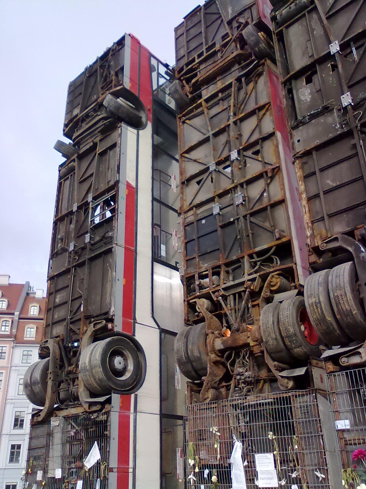 Ne, nejde o nějakou dopravní kalamitu nebo šprajc saských řidičů, jak by se nabízelo. Tyhle autobusy stojí „na zadcích“ na náměstí u kostela Frauenkirche už od začátku února a trčet k nebi je tam nechal německo-syrský umělec Manaf Halbouni. V místě to prý vyvolalo vášně nevole i vole, trochu se o tom mluvilo na české straně, a teď, po pár týdnech je, zdá se, zatím klid. Tak jsem se zašel podívat na vlastní oči.
