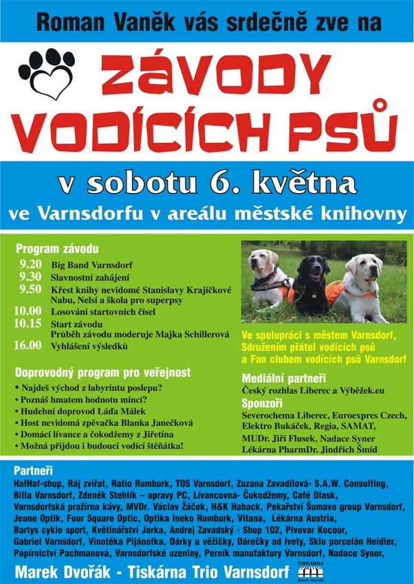 Ve čtvrtek 4. května 2017 začal program účastníků sobotních závodů vodicích psů, pokud mám info, večer v malém sálku varnsdorfské sportovní haly pro ně připravilo stduo Doteky „Velediv“ (veselé lesní divadlo), hrát bude Darudaj a budou se číst varnsdorfské pověsti.
