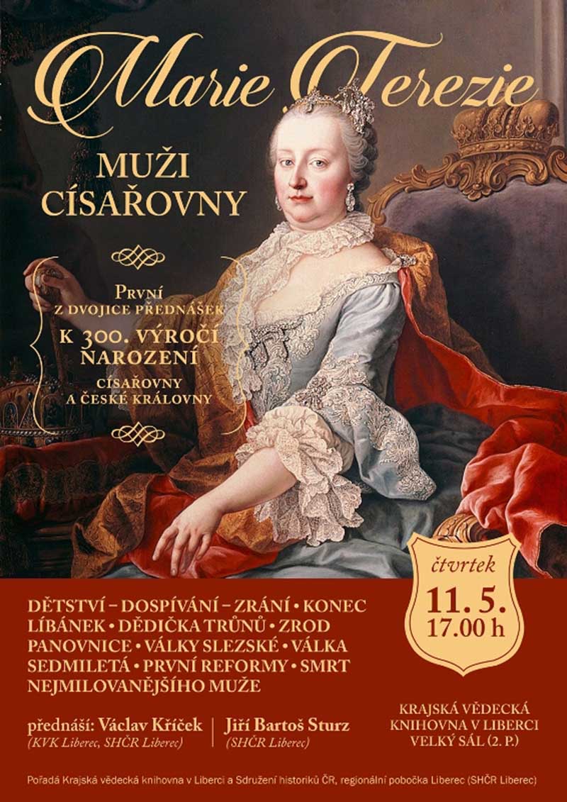 Letošní rok si připomínáme 300. výročí narození císařovny Marie Terezie. Ve čtvrtek 11. 5. od 17 hodin si můžete vyslechnout přednášku Marie Terezie: Císařovna a její muži, jejímž tématem bude nástup a vláda Marie Terezie a muži, kteří stáli císařovně po boku v době její vlády. Blíže budou rozvedeny nástup na trůn a boje o zachování Habsburské říše. V přednášce bude také zmíněn vliv tohoto období na náš region. Druhá, navazující, přednáška Marie Terezie: Císařovna a její děti se bude konat ve čtvrtek 25. 5. od 17 hodin.