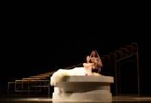 A: scénografové si v Liberci oblíbili houpačky. Kromě toho, že je tento prvek součástí scény Mnoha povyku pro nic, můžete stejnou(?) vidět i v opeře Její pastorkyňa a také (jinou) ve Válce v Malém divadle.